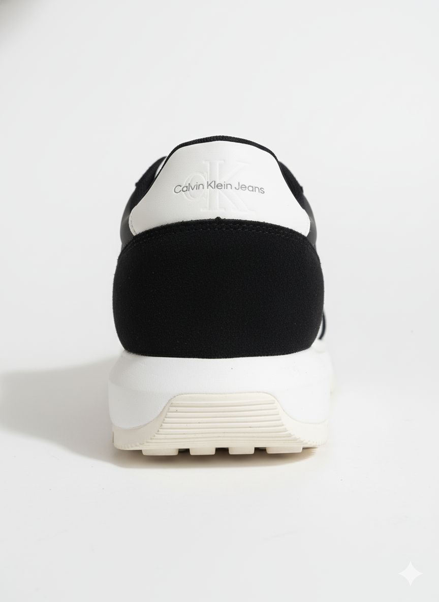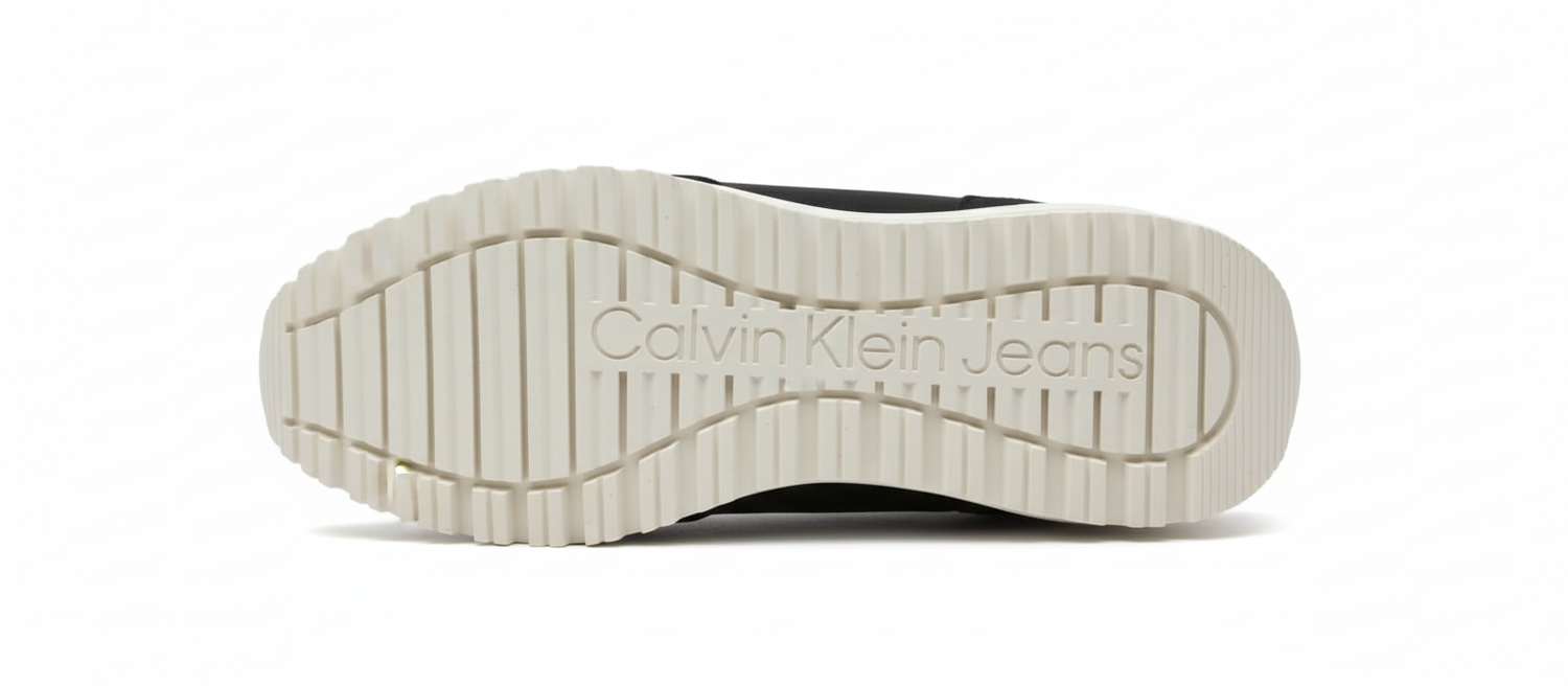 The upper features a sleek combination of durable textile and luxurious suede in a deep black hue, ensuring optimal breathability and a refined appearance. The iconic Calvin Klein Jeans logo is prominently displayed, adding a touch of luxury and signature branding. The lightweight and innovative outsole, in a contrasting light tone, provides superior traction and exceptional flexibility for comfortable all-day wear.