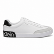These Calvin Klein sneakers feature a clean, modern design with a sleek low-top silhouette. Crafted from smooth white leather, the shoe is accented with a light gray textured overlay at the toe for subtle contrast and added durability. The black heel panel adds a bold touch, highlighted by the oversized Calvin Klein logo for a signature branded finish.