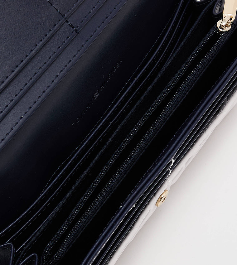 Elevate your accessories collection with this chic Tommy Hilfiger women’s wallet, crafted in a sleek white tone with an all-over embossed TH monogram pattern. The flap design is accented by a refined gold-tone Tommy Hilfiger logo, adding a touch of luxury to its minimalist style. Inside, the wallet offers organized storage for cards, cash, and essentials—perfect for everyday use or pairing with your favorite handbag. Stylish, practical, and effortlessly elegant, this wallet is a must-have finishing touch for any modern wardrobe