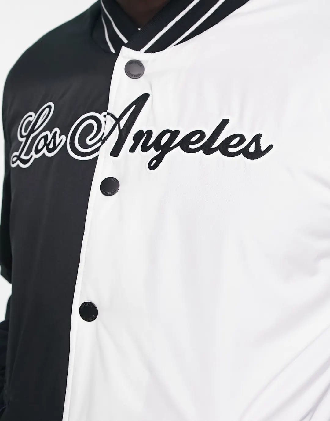 • Text Detail: Bold, contrasting "Los Angeles" script embroidery is prominently featured across the chest, with the white script on the black side and the black script on the white side, enhancing the split effect.
