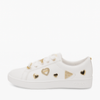 Make a glamorous statement with these stunning GUESS white low-top sneakers. Adorned with gold-tone heart and triangle studs, pearl accents, and sparkling rhinestone details, this pair blends fashion and femininity in every step. The sleek synthetic leather upper and clean white sole deliver a polished look, while the soft lining and cushioned insole keep your feet comfortable all day long. Perfect for elevating casual outfits or adding flair to your everyday look.