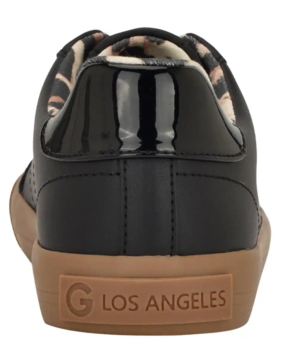 Upgrade your casual wardrobe with these stylish black sneakers from Guess. Designed with a sleek matte-black upper, complemented by suede detailing and a signature metallic “G” logo, this pair delivers modern elegance with everyday comfort. The gum outsole adds a trendy contrast while providing durability and traction. Finished with a chic leopard-print lining for a touch of personality, these sneakers are perfect for daily wear, outings, or elevating your street-style looks