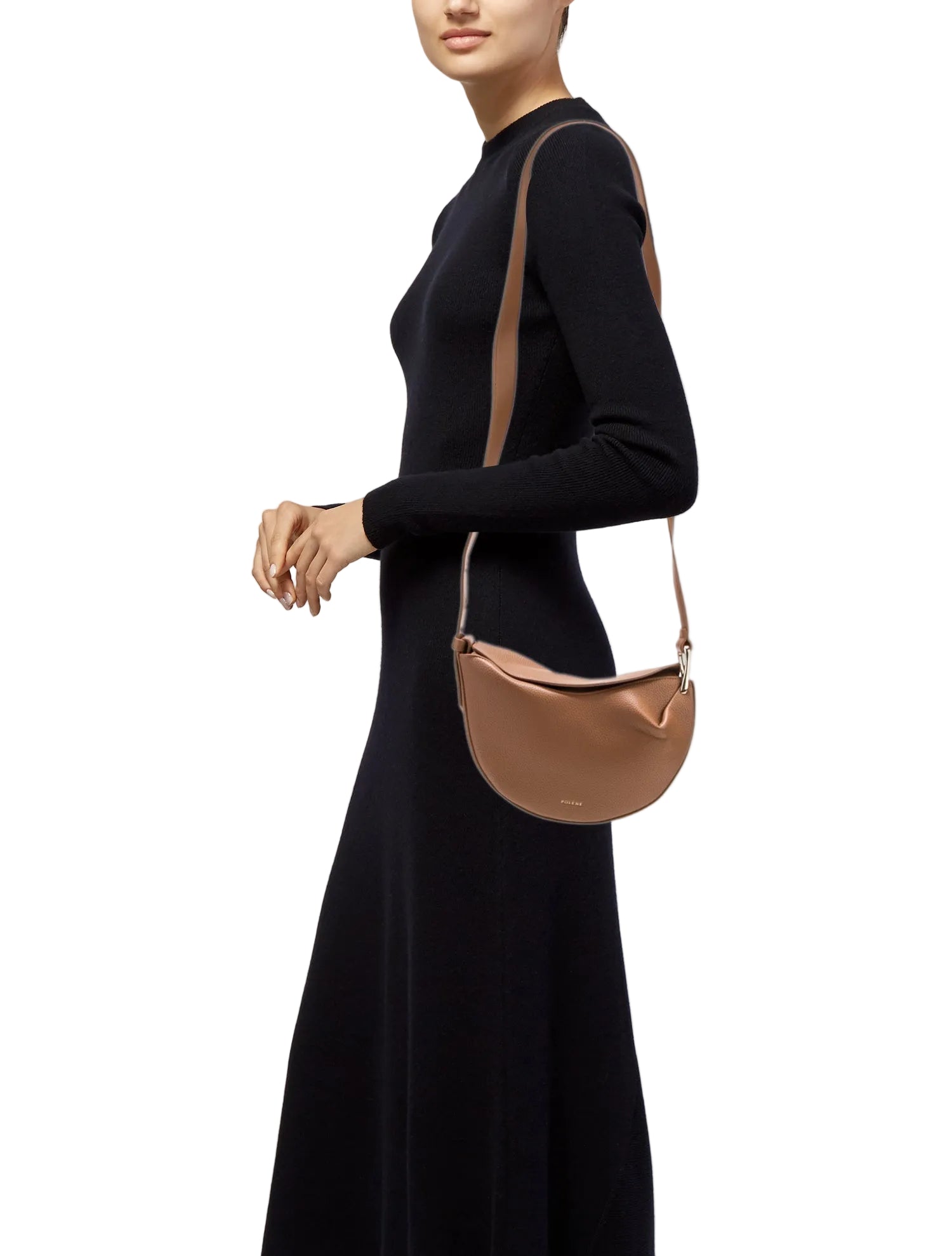 - The Polène Cognac Textured Leather Shoulder Bag is a modern and sculptural piece that showcases the brand’s signature minimalist aesthetic. Crafted from premium full-grain textured leather, it features a crescent-shaped silhouette with refined curves and a structured body. The adjustable wide strap offers versatile wear, whether carried on the shoulder or crossbody. Finished with subtle gold-stamped branding, this timeless design is perfect for elevating both casual and sophisticated looks